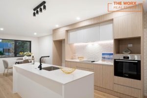 The contemporary kitchen is the heart of the home, featuring a spacious island, engineered stone benchtops, and quality Bosch appliances-making cooking and hosting effortless and enjoyable.