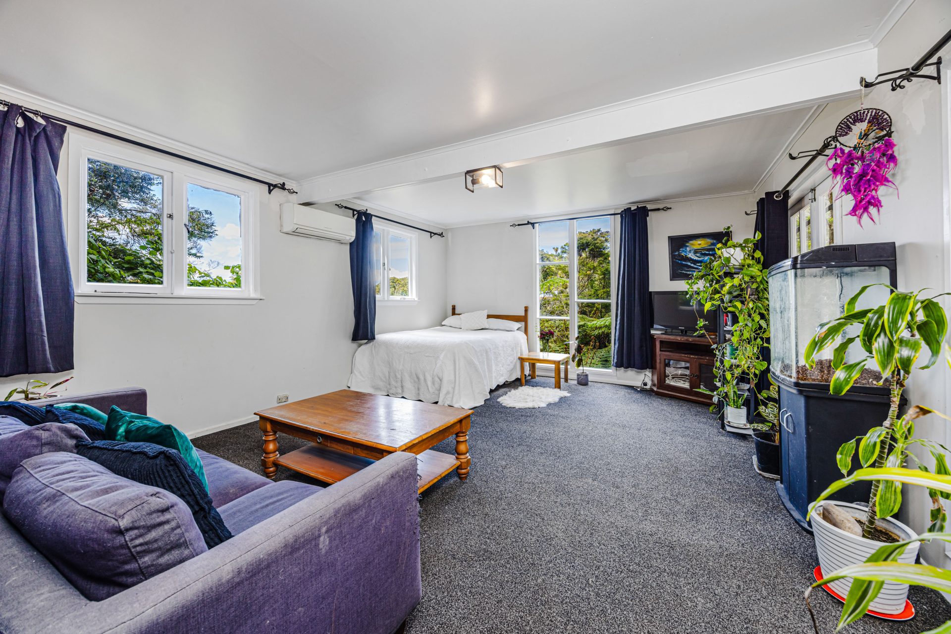 Bathed in natural light, the open living areas frame peaceful views of the surrounding native bush, offering both privacy and serenity.